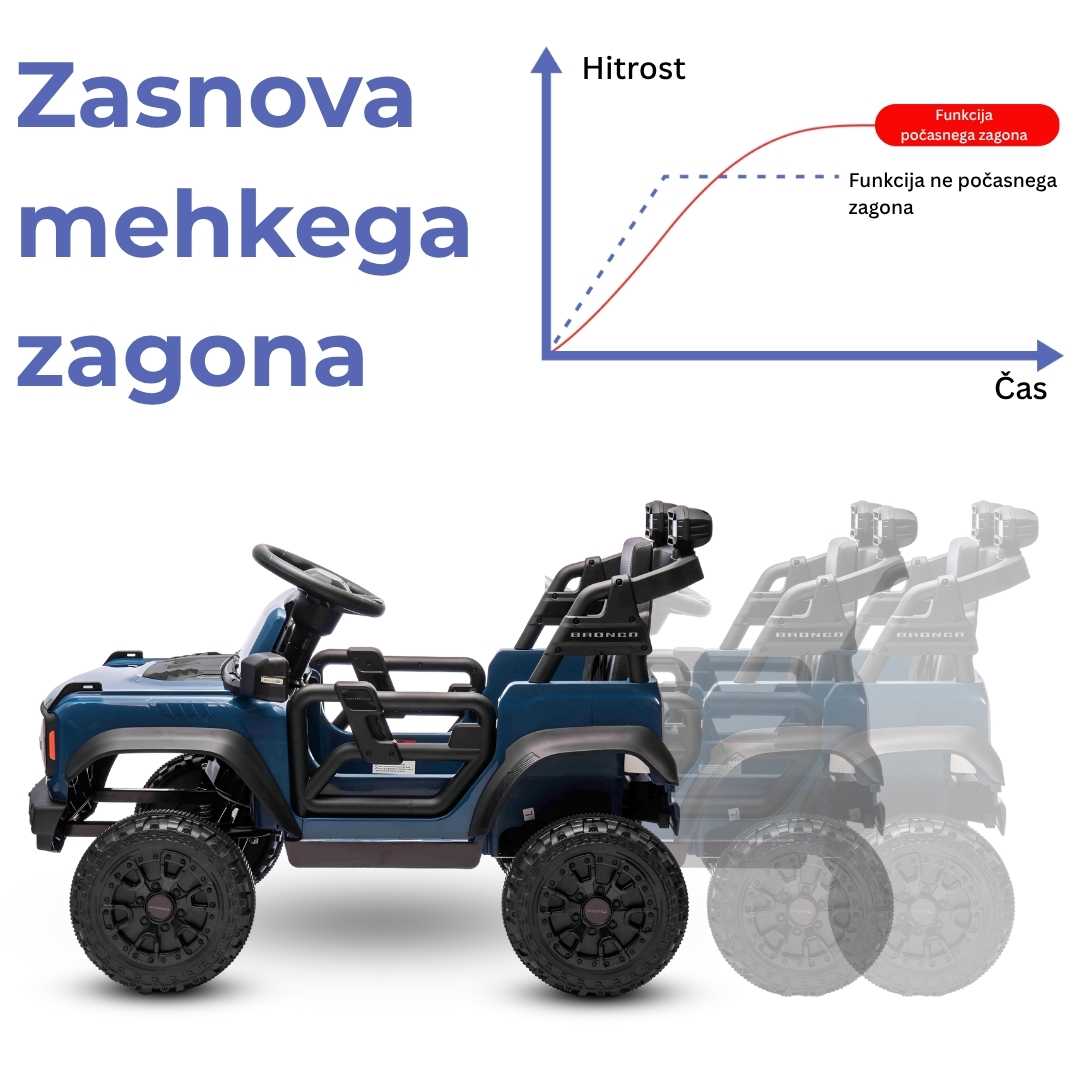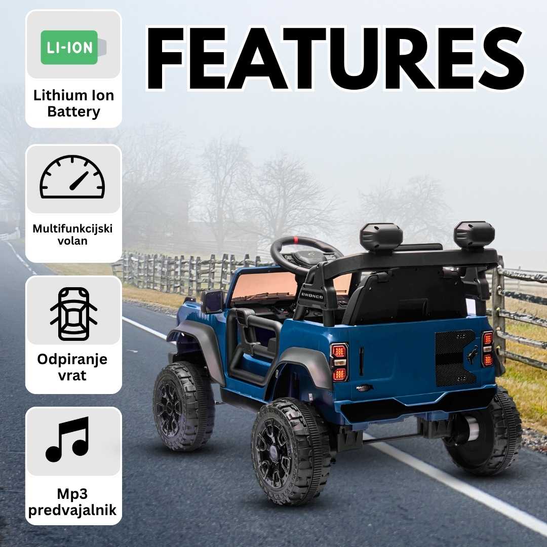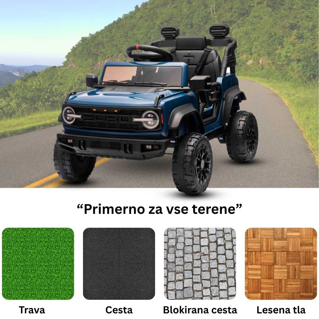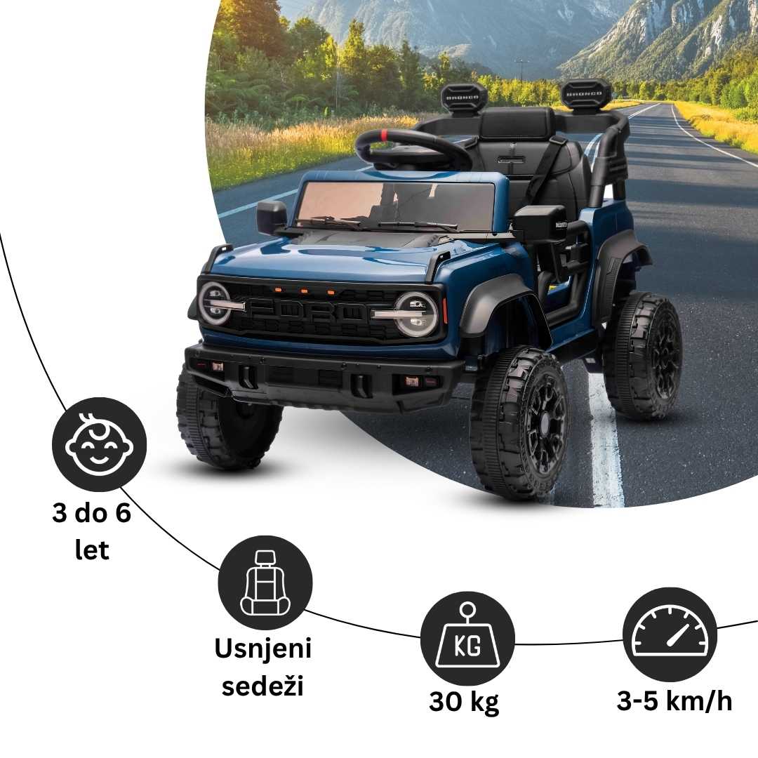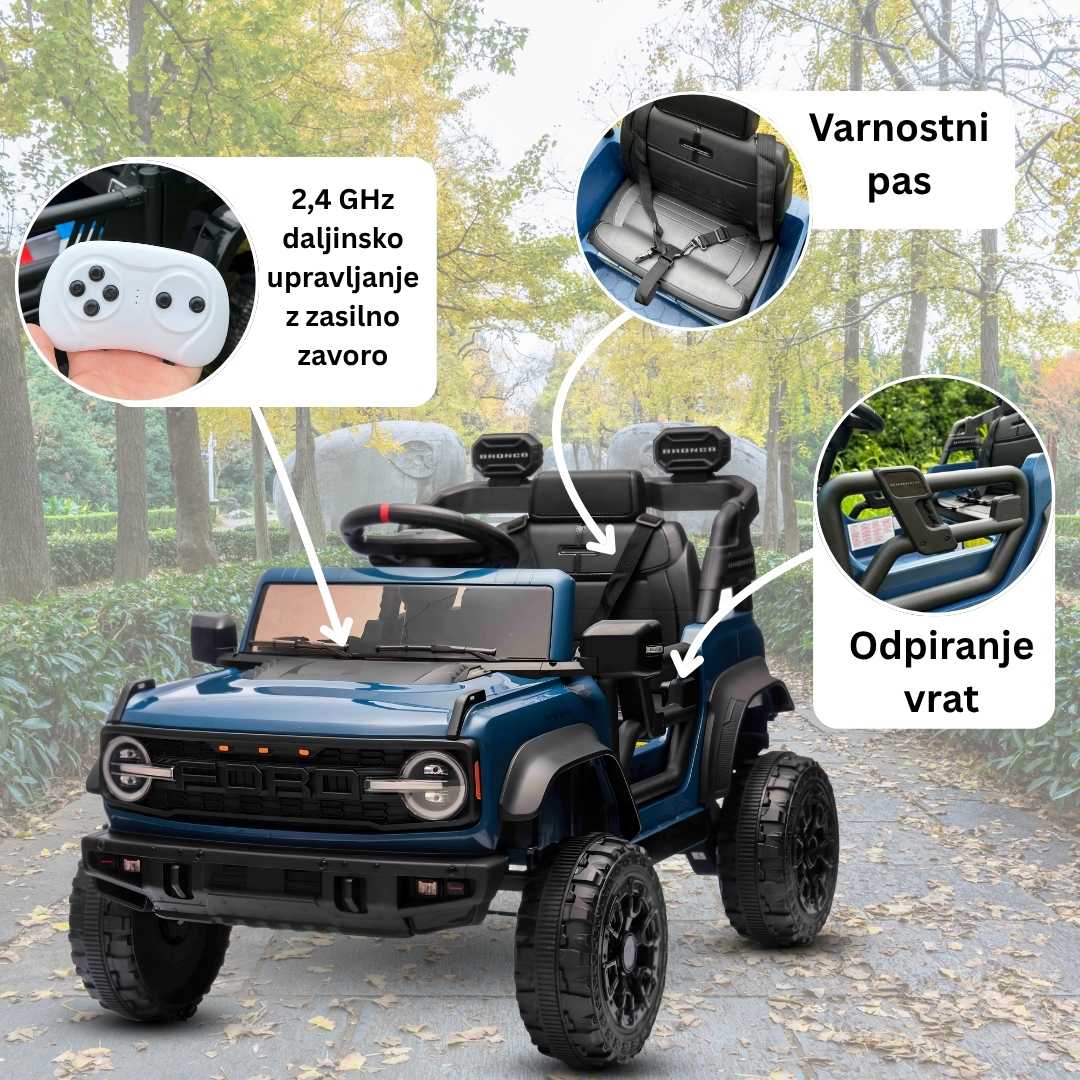Električni avtomobilček Ford Bronco s pogonom na zadnja kolesa z dovoljenjem (enojni sedež), modra, litijeva baterija, visoka šasija, širok sedež, vzmetenje zadnje osi, 2,4 GHz daljinski upravljalnik, MP3 predvajalnik z USB vhodom, LED luči