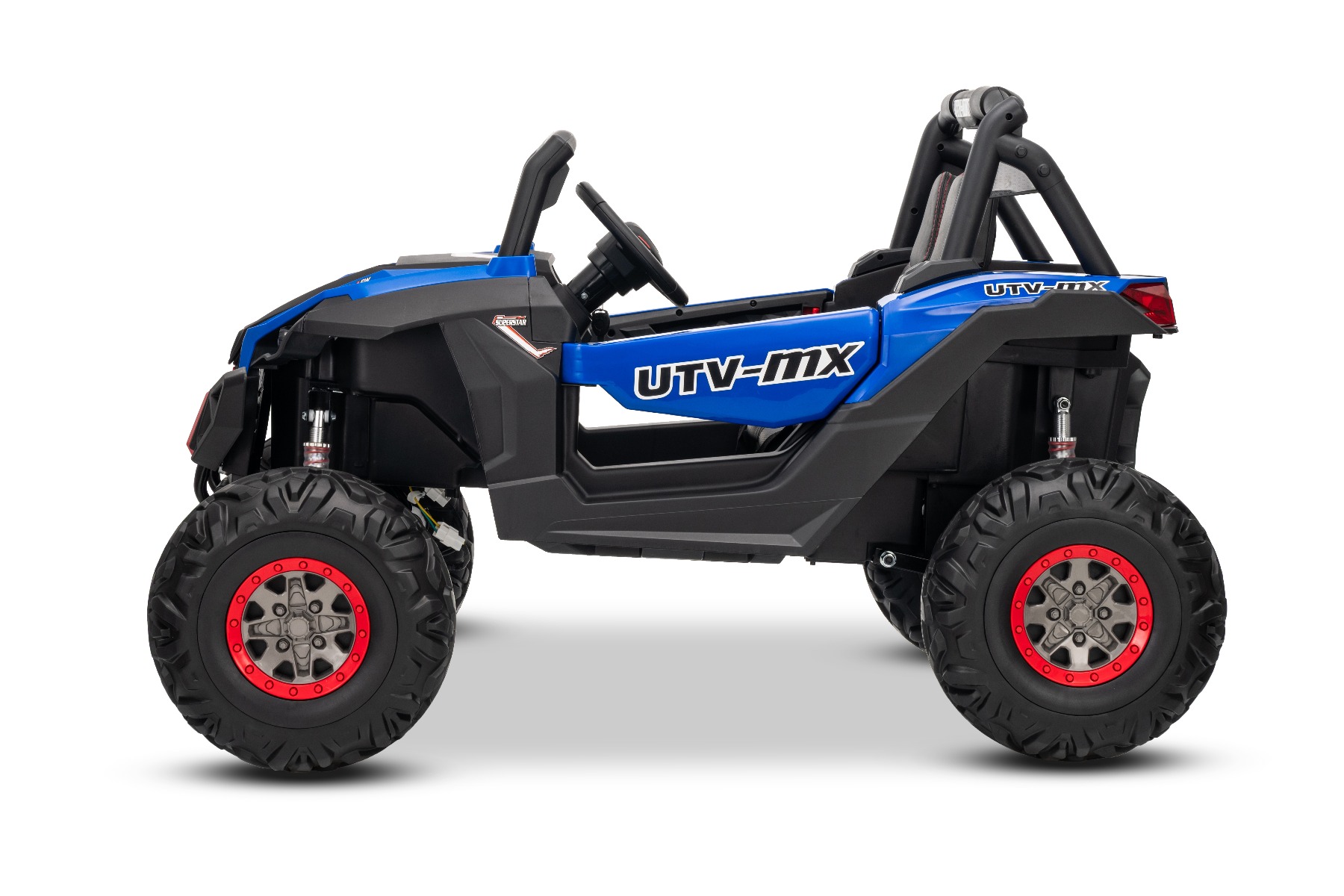 Električni avtomobilček NOV RSX 24V, Modra barve, pogon 4x4, litijeva baterija, EVA kolesa, vzmetene osi, dvosedežni sedež iz umetnega usnja, daljinski upravljalnik, MP3 predvajalnik z USB/AUX vhodom