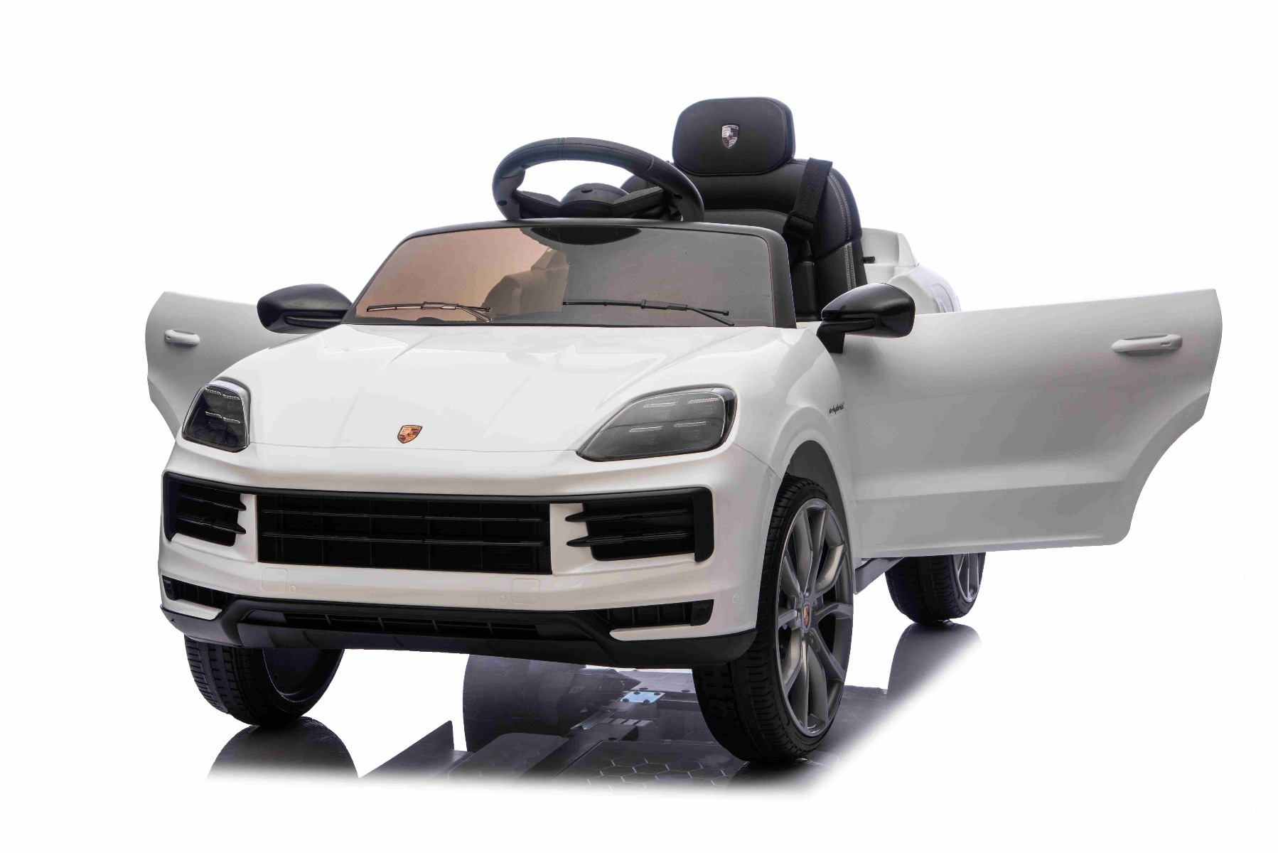 Električni avtomobilček Porsche Cayenne 12V z zadnjim pogonom in registrsko številko (enojni sedež), bel, litijeva baterija, širok sedež, vzmetene osi, 2,4 GHz daljinski upravljalnik, MP3 predvajalnik z USB/AUX vhodom, LED luči